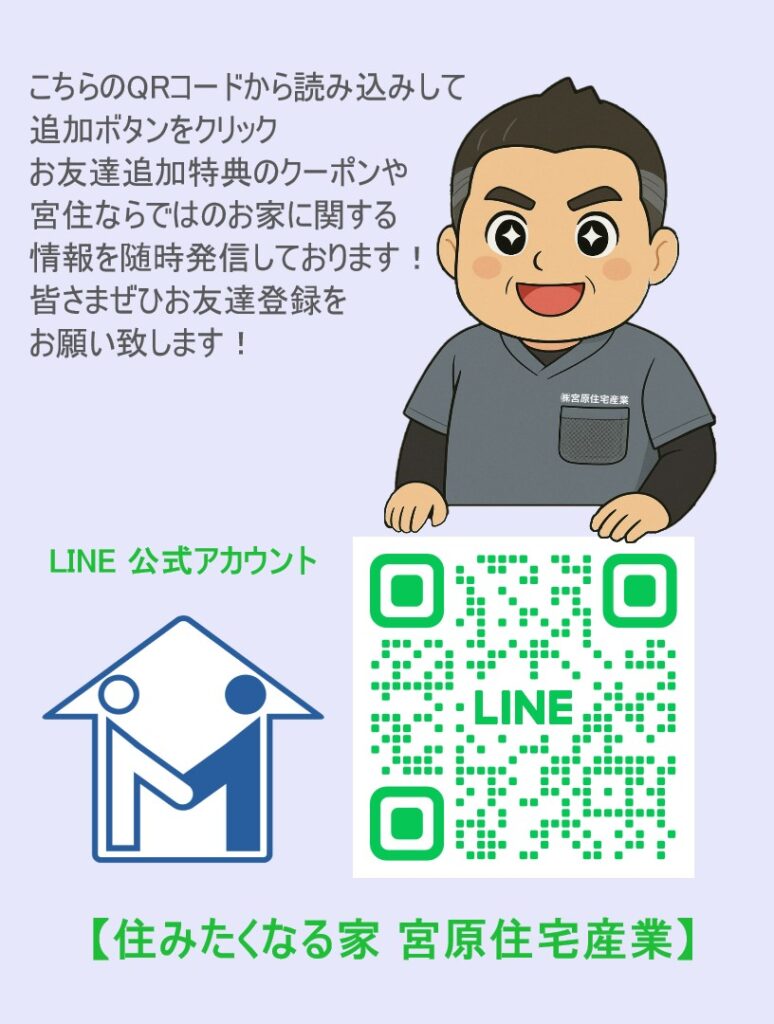 ニュース 住みたくなる家 > ニュース > 宮住 LINE 公式アカウント のお知らせ ニュース 2025年10月21日 宮住 LINE 公式アカウント のお知らせ Facebookでシェア twitterでツイート