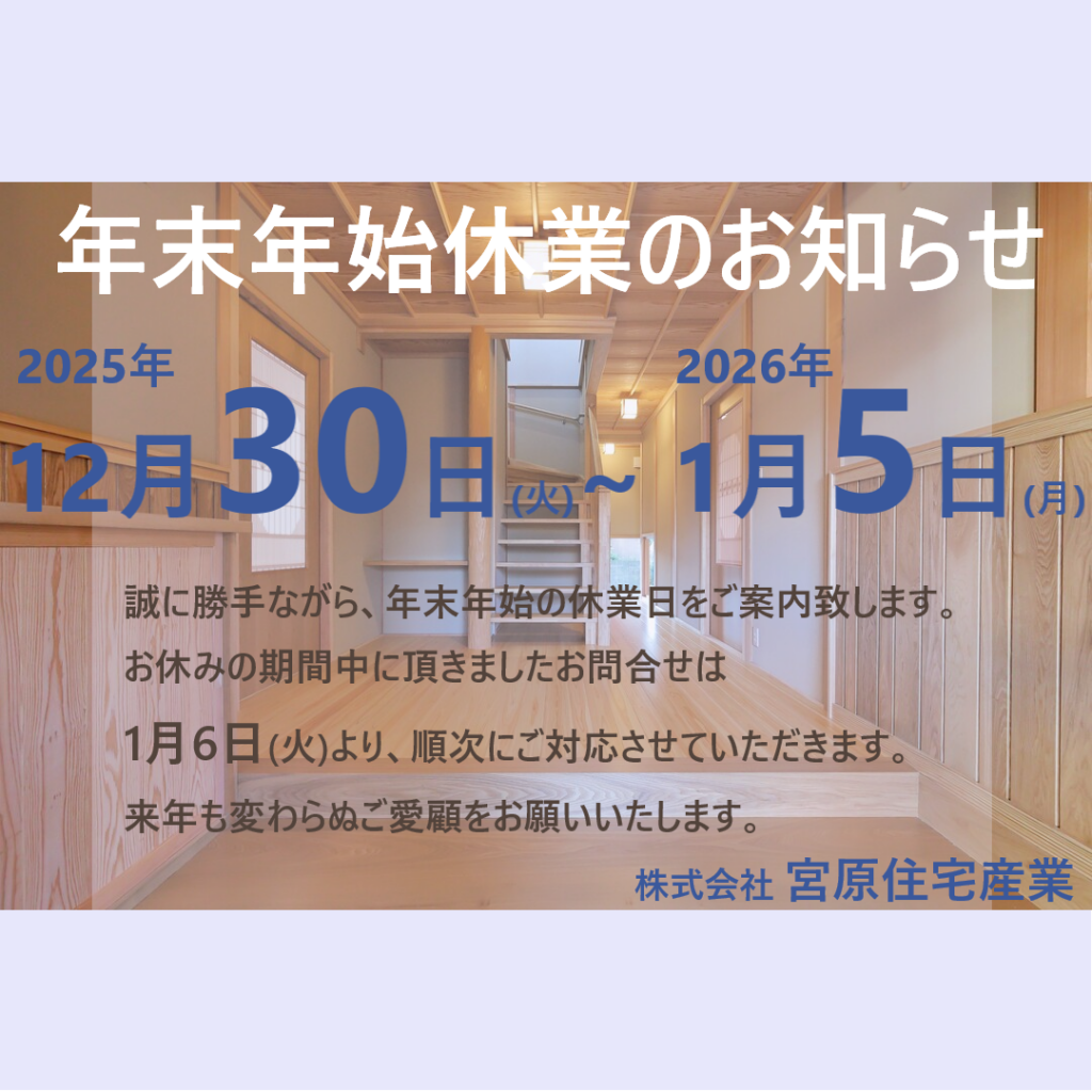 ニュース 住みたくなる家 > ニュース > 年末年始休業のお知らせ(2025年-2026年) ニュース 2025年12月26日 年末年始休業のお知らせ(2025年-2026年) Facebookでシェア twitterでツイート